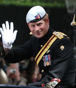 Von Mai 2005 bis April 2007 erhielt Prinz Harry an der Royal Military Academy Sandhurst eine Offiziersausbildung. Im April 2006 wurde er in Anwesenheit seiner Großmutter, Königin Elisabeth II., vereidigt und Mitglied des Gardekavallerieregiments Blues and Royals. Während des Militärdienstes verwendete er den Namen Harry Wales.[5] Im Mai 2007 sollte er mit dem Regiment im Irak eingesetzt werden. Seine Vorgesetzten entschieden jedoch, dass sowohl er als auch seine Kameraden dadurch einer übermäßigen Gefährdung ausgesetzt wären, da irakische Untergrundorganisationen mit Anschlägen gedroht hatten. Von Mitte Dezember 2007 bis Ende Februar 2008 war Prinz Harry im Rahmen des ISAF-Einsatzes in der Provinz Helmand im Süden Afghanistans stationiert und nahm dort wie andere Offiziere an Fronteinsätzen teil.[6] Dieser Umstand war zunächst nur wenigen Journalisten bekannt; nach öffentlichem Bekanntwerden wurde er wegen Sicherheitsbedenken am 29. Februar 2008 vorzeitig aus Afghanistan abgezogen.[7]