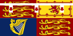 | Coat of Arms of HRH Prince Henry, Duke of Sussex . (born 1984) second son of Prince Charles, Prince of Wales and Lady Diana Spencer. The coat of arms was granted in September 2002, on his 18th birthday. The three small red ‘escallop’ or sea-shell on the label alludes to the arms of his mother and the Spencer family. 1 “ Quarterly, 1st and 4th Gules three lions passant guardant in pale Or armed and langued Azure (for England), 2nd quarter Or a lion rampant within a double tressure flory-counter-flory Gules (for Scotland), 3rd quarter Azure a harp Or stringed Argent (for Ireland), with over all a label of three points Argent all charged with an Escallop Gules, the escutcheon ensigned by a coronet of a child of the Sovereign (after his father's accession in 2022), for a crest on a coronet of his rank, thereon a lion statant guardant Or crowned of the same coronet charged with a label as in the arms, for supporters, dexter a lion rampant guardant Or crowned by the same coronet, sinister a unicorn Argent armed, crined and unguled Proper, gorged with the same coronet, attached thereto a chain affixed thereto passing between the forelegs and reflexed over the back also Or, both charged on the shoulder with a label as in the arms. ” | Eigenes Werk | Sodacan | Datei:Coat of Arms of Harry, Duke of Sussex.svg | |