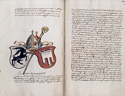 | Geschichte der Bistümer Chur, Hildesheim und Paderborn. Papier, 28.5 x 20 cm. Stuttgart, Württembergische Landesbibliothek, HB V 33; hier: fol. 80v, Wappen des Bischofs von Chur, Hartmann von Werdenberg | Mäzene, Sammler, Chronisten. Die Grafen von Zimmern und die Kultur des schwäbischen Adels . Ausstellungskatalog, 2012, ISBN 978-3-7630-2625-8 | Autor/-in unbekannt Unknown author | Datei:Wilhelm Werner von Zimmern Bistumschronik Bd 4 WLB HB V 33 fol 80v.jpg |