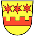 „In Gold ein erniedrigter, oben gezinnter roter Balken, darüber balkenweise drei sechsstrahlige rote Sterne“.[3]
