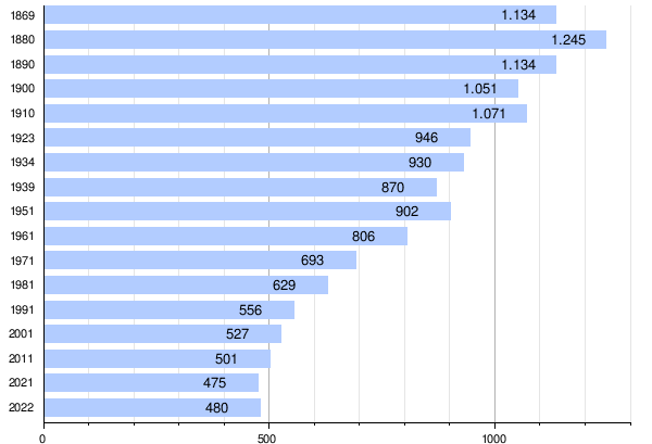 Die Einwohnerzahl nimmt seit vielen Jahrzehnten kontinuierlich ab. Seit 1981 sind sowohl die Geburtenbilanz als auch die Wanderungsbilanz negativ, wobei die Abwanderung in den letzten Jahren abnahm.[6]