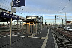| Nordende des Bahnsteigs 12/13, vorher 11/12, Richtung Norden, wegen der zum Aufnahmezeitpunkt gesperrten Westseite wird der Interimsbahnsteig 13a noch benötigt. Um den umständlichen Zugang zu verkürzen, entstand ein ebenfalls provisorischer Zugang. Das Gleis 13 ist solange funktionell ein nur von Süden erreichbares Stumpfgleis. Wegen des fehlenden Hallendaches liegt der Aufzug für den Bahnsteig 12/13 im Freien. | Eigenes Werk | Falk2 | Datei:J34 046 Bf Halle (S) Hbf, Übergang zum Bahnsteig 13a.jpg | |