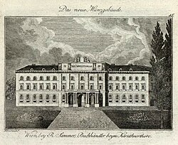 | Hauptmünzamt Wien, Kupferstich. | Franz Carl Weidmann: "Neuestes Panorama von Wien oder malerische Ansichten der vornehmsten und merkwürdigsten Plätze, Straßen, Paläste, Kirchen, Klöster, Gärten und anderen vorzüglicheren Gebäuden der k. k. Haupt- und Residenzstadt Wien, ihrer Vorstädte und Umgegend". 2. Auflage, ca. 1838/39. | Caspar Weinrauch | Datei:Münzgebäude-1838.jpg | |