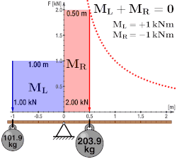 Ein Hebel befindet sich im Gleichgewicht, wenn die Summe aller an ihm anliegenden Drehmomente bezüglich desselben Bezugspunktes (nicht notwendigerweise der Drehpunkt) gleich Null ist: