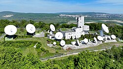 | Südansicht der Abhörstation bzw. der Fernmeldeaufklärungsanlage auf der 344 Meter hohen Königswarte und direkt auf der Grenze der niederösterreichischen Gemeinden Wolfsthal und Berg gelegen. Die „Abhörstation“ wurde auf dem östlichsten Berg Österreichs ab 1958 errichtet und von den USA (mit)finanziertː 1 . Genutzt wird sie unter anderem von der National Security Agency (NSA)ː 2 . Man schätzt mindestens 150 Millionen Euro an Errichtungskostenː 3 . | Eigenes Werk | C.Stadler/Bwag | Datei:Königswarte - Spionagestation (a).JPG |