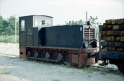 | Vor 1970 hatte die Maschine die Betriebsnummer Kö 6001, zum Aufnahmezeitpunkt wird sie für Arbeitszüge bei der Oberbauereneuerung eingesetzt. Unklar ist, wieso die baugleiche 100 902 1973 in 199 002 umbezeichnet wurde, während die 100 901 ihre erste EDV-Nummer behielt. Ausgemustert und zerlegt wurde sie 1985. Die Lokomotive hat keine Druckluftausrüstung und deshalb an Stelle einer Fahrzeugpfeife zwei kfz-typische Hupen zwischen den Stirnwandfenstern. Eine Tankstelle gibt es hier nicht, deshalb liegt eine Fasspumpe vor dem Kühler zwischen den Loklaternen. | Eigenes Werk | Falk2 | Datei:00 519 Bf Binz Ost, 100 901.jpg | |