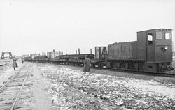 | Informationen, die durch Benutzer hinzugefügt wurden. Location is a light railway Hyrynsalmi-Kuusamo in northern Finland. Railway (178 km) was built by Germans during 1942-1944, demolished 1944. Locomotive is a German Heeresfeldbahnlokomotive HF130C. | Dieses Bild wurde im Rahmen einer Kooperation zwischen dem deutschen Bundesarchiv und Wikimedia Deutschland aus dem deutschen Bundesarchiv für Wikimedia Commons zur Verfügung gestellt. Das deutsche Bundesarchiv gewährleistet eine authentische Bildüberlieferung nur durch die Originale (Negative und/oder Positive), bzw. die Digitalisate der Originale im Rahmen des Digitalen Bildarchivs . | Autor/-in unbekannt Unknown author | Datei:Bundesarchiv Bild 101I-107-1312-20, Nordeuropa, Feldbahn im Schnee.jpg | |