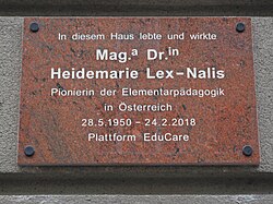 | Memorial plaque to Heidemarie Lex-Nalis | Eigenes Werk | GuentherZ | Datei:Wien11 Krausegasse007a GD Lex-Nalis 2019-01-25 GuentherZ 3983.jpg |