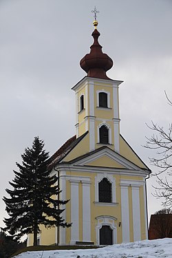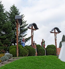 - Kalvarienbergkirche: Die Kalvarienbergkirche ist der Schmerzhaften Mutter geweiht. Sie ist ein einschiffiger Bau mit einer Einturmfassade und wurde 1756 von Johann Georg Stengg errichtet. Der Innenraum besitzt einen annähernd quadratischen Grundriss, eine flache Altarnische und eine geschwungene Sängerempore. Am Altar befindet sich eine Beweinungsgruppe mit Engeln von 1762. Dahinter sind auf einem Fresko Engel mit den Arma Christi, Gottvater und eine Ansicht von Jerusalem dargestellt. Die Kanzel und das Bild der Unbefleckten Empfängnis stammen aus dem dritten Viertel des 18. Jahrhunderts.[7]