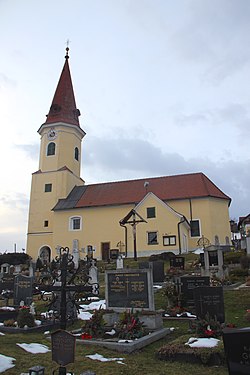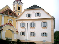 - Neben der Pfarrkirche befindet sich der dreigeschoßige Pfarrhof, der 1790 bezogen wurde.[6]