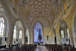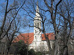 | Die Südwestansicht der Pfarrkirche St. Michael in Heiligenstadt , ein Bezirksteil des 19. Wiener Gemeindebezirkes Döbling . Ein dreischiffige Staffelkirche, die unter Einbeziehung der Grundmauern und des Chores der Vorgängerkirche im neugotischen Stil und ähnlich der Vorgängerkirche (bis auf den Turm) nach Plänen von Richard Jordan , unter Beteiligung von Martin und Josef Schömer , ab 1894 errichtet und am 26. Mai 1898 eingeweiht wurde. | Eigenes Werk | C.Stadler/Bwag | Datei:Heiligenstadt (Wien) - Kirche St. Michael.JPG | |