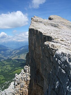 | Die nach Westen abfällenden Wände des Heiligkreuzkofels | ||