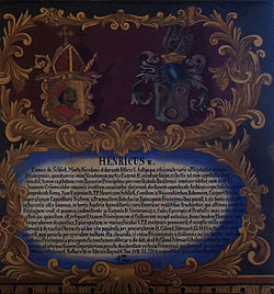 | Wappentafel von Heinrich II. Schlick, Fürstbischof von Freising, im Fürstengang zwischen Fürstbischöflicher Residenz und Freisinger Dom. Links das geistliche, rechts das persönliche Wappen, darunter ein lateinischer Text mit kurzer Biographie. | Photo from the Fürstengang in Freising | Franz Joseph Lederer (1676-1733) and others | Datei:Fürstengang Tafel 42 - Heinrich II. Schlick.jpg | |