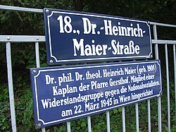 - 1949 Benennung der Dr.-Heinrich-Maier-Straße in Wien-Pötzleinsdorf, 1995 wurde das Straßenschild mit einer Zusatztafel versehen