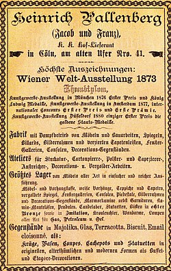 | Anzeige der Möbelmanufaktur Heinrich Pallenberg vor 1895 | Werbeanzeige um 1895 | Scan aus Mario Kramp, Ulrich Soénius (Hrsg.): Made in Cologne – Marken für die Welt. J.P. Bachem-Verlag, Köln 2. Auflage 2015. ISBN 978-3-7616-2750-1 , S. 141-143 | Datei:Pallenberg Diplom Wiener Weltausstellung 1873.jpg | |