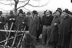 | Es folgt die historische Originalbeschreibung , die das Bundesarchiv aus dokumentarischen Gründen übernommen hat. Diese kann allerdings fehlerhaft, tendenziös, überholt oder politisch extrem sein. Januar 1956 Diplomaten-Jagd im Hunsrück auf Einladung von Außenminister Heinrich von Brentano | Dieses Bild wurde im Rahmen einer Kooperation zwischen dem deutschen Bundesarchiv und Wikimedia Deutschland aus dem deutschen Bundesarchiv für Wikimedia Commons zur Verfügung gestellt. Das deutsche Bundesarchiv gewährleistet eine authentische Bildüberlieferung nur durch die Originale (Negative und/oder Positive), bzw. die Digitalisate der Originale im Rahmen des Digitalen Bildarchivs . | Unterberg, Rolf | Datei:Bundesarchiv B 145 Bild-F003234-0010, Hunsrück, Diplomatenjagd.jpg | |