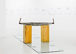 | Heinz Baumueller: Singende Saege, 1985-2007Glasgrundriss / glass plate 400 x 145 x 1 cm, Glas, Holz, Saege, Draht / glass, wood, saw, wire | www.fredurbanke.de | Fred Urbanke | Datei:Heinz Baumueller Singende Saege1985-2007.jpg | |