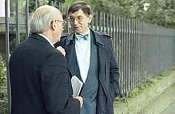 | Der Bundestagsabgeordnete Heinz Riesenhuber im Gespräch am Zaun des Bundeskanzleramtes. Innenansichten unseres Parlaments. Impressionen während der Parlamentarischen Woche im Juni 1995 in: Der Dreizehnte Deutsche Bundestag. Innenansichten unseres Parlaments. ISBN 3-87576-357-2 . Seite 132 | http://andreasbohnenstengelarchiv.de | Andreas Bohnenstengel | Datei:Bundeshauptstadt Bonn 07.jpg | |