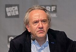 | Der österreichische Kulturjournalist und Autor Heinz Sichrovsky auf der ORF-Bühne der Wiener Buchmesse 2018 . | Eigenes Werk | C.Stadler/Bwag | Datei:Heinz Sichrovsky - Buchmesse Wien 2018.JPG |