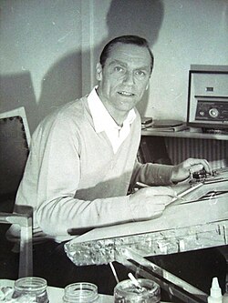 | Porträt von Heinz Traimer bei seiner Arbeit in der Kahlenberg- Graphik. | Eigenes Werk | Matthaeuswien | Datei:Heinz Traimer Grafik Designer Wien um 1970.JPG | |