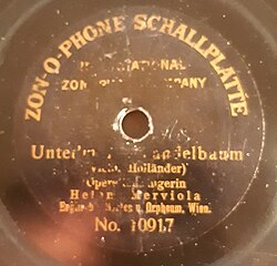 | Schallplatte von Helene Merviola (Wien 1902) | Eigenes Werk | Zylberglajs | Datei:Merviola, Helene.jpg | |