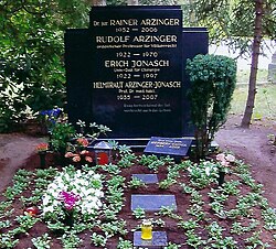 | Grab von Helmtraut Arzinger-Jonasch , ihrem Stiefsohn Dr. iur. Rainer Arzinger, ihrem zweiten Ehemann Prof. Dr. iur. Rudolf Arzinger und dem dritten Ehemann, dem österreichischen Chirurgen Erich Jonasch. Unten rechts ist die Gedenktafel für ihren ersten Ehemann Herbert Gunia (1934–2009). | Archiv Thomas Gunia | Thomas Gunia, Leipzig (Sohn von Helmtraut Arzinger-Jonasch und Herbert Gunia) | Datei:Grab Arzinger-Jonasch.jpg | |