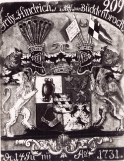 | Wappen für den königlich schwedischen Generalmajor (seit 1739 Generalleutnant der Infanterie) Baron Henrik Magnus Buddenbrock Friherre Hindrich Magnus von Buddenbrock (1685–1743), anlässlich der Introduzierung auf dem Ritterhaus (Riddarhus) Stockholm bei der Freiherrenklasse (Friherrligt stånd) am 14. Juni 1731 unter Nr. 209. -Herzschild: Stammwappen Buddenbrock. 1. Helm: Stammwappenzier (hier die älteren Pfauenfedern). 2. Helm wohl für militärische Verdienste (Kommandoflaggen, dazwischen liegender Halbmond). | Armorial Riddarhus, Stockholm | Autor/-in unbekannt Unknown author | Datei:Buddenbrock-Wappen Freiherren 1731.png | |