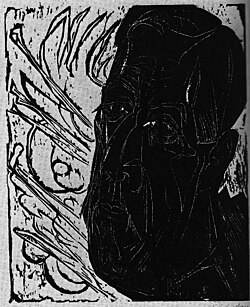 Denkmalgeschützte Jugendstilvilla Hohenhof in Hagen , Stirnband 10. Das Herren- oder Arbeitszimmer von Karl Ernst Osthaus wird durch einen achsensymmetrischen Grundriss geprägt. Die Breite der Schreibtischnische definiert die Raumachse, betont durch vier auf Holzpostamenten aufliegende, üppige Ziervoluten. Die eingebauten Möbel aus grau polierter Esche und das übrige Mobilar wurden von Henry van de Velde entworfen. Die orange, graugrün und blau gehaltene Wand- und Deckenschablonenmalerei 1911 von Johan Thorn Prikker aufgetragen. Fliesentableau, Andalusien (16. Jh.). Links Buddha-Kopf aus Stein. Rechts Bronze-Skulptur „Frau ihr Haar kämend“ von Alexander Archipenko , 1915. | Eigenes Werk | Bärwinkel,Klaus | Datei:Hagen - Hohenhof 11.JPG | |