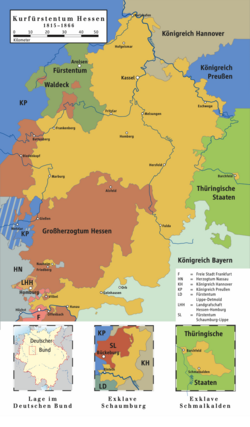 | Karte des Kurfürstentums Hessen 1815–1866. Kartenbeschriftungen: Fürstentum Waldeck, Königreich Hannover, Königreich Preußen, Großherzogtum Hessen, Thüringische Staaten, Königreich Bayern, Kassel, Arolsen, Alsfeld, Fulda, Hersfeld, Homburg, Offenbach. | own drawing/Source of Information: Putzger – Historischer Weltatlas, 89. Auflage, 1965; Westermanns Großer Atlas zuur Weltgeschichte, 1969; Haacks geographischer Atlas. VEB Hermann Haack Geographisch-Kartographische Anstalt, Gotha/Leipzig, 1. Auflage, 1979. | ziegelbrenner | Datei:Electorate of Hesse.png |