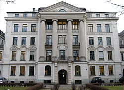 | Leopoldstraße 4; Ehem. herrschaftliches Wohnhaus, jetzt Bayerische Rückversicherung, palastartiger Bau im klassizistischen Jugendstil, mit Stuckdekor und mächtigem Portikus, 1896-97 von Martin Dülfer; Mittelteil einer durch niedrige Zwischenbauten verbundenen Häusergruppe, siehe Nr. 6 und Schackstraße 1 | Eigenes Werk | Rufus46 | Datei:Leopoldstr. 4 Muenchen-1.jpg |