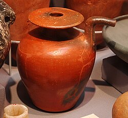 | Altägyptische Keramik. Wasserkanne aus Turah, ca. 2900 v. Chr., Kunsthistorisches Museum Wien, Inv.-Nr. 6743, Keramik, poliert Gefäß mit Ausguß, aus feinem Ton hart gebacken. Dunkelrot, tadellos poliert; der Schaft des Ausgusses dagegen schwarz. Die Seitenwände ganz dünn, der breite Rand massiv. Junker Sondertyp 1 Siehe: Hermann Junker, I. Bericht über die Grabungen der Kaiserl. Akademie der Wissenschaften in Wien auf dem Friedhof in Turah, Wien 1912, S. 43 und S. 44 Abb. 50 | Eigenes Werk | David Schmid | Datei:KHM-Keramik-024.jpg | |