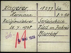 | Registration card of Hermann Kagerer as a prisoner at Dachau Nazi Concentration Camp. The red “M” penciled on the left indicates Kagerer's transfer to Mauthausen. Arolsen Archives' DocID: 10672081 | Arolsen Archives - International Center on Nazi Persecution www.arolsen-archives.org | Arolsen Archives | Datei:Hermann Kagerer Dachau Arolsen Archives.jpg |