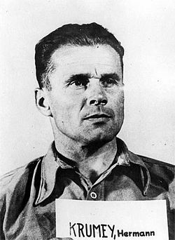 | Hermann Krumey (1905-1981), German SS-Officer working with Eichmann in the RSHA. This photograph of Krumey as a witness was taken by US Army photographers on behalf of the Office of Chief of Counsel for War Crimes (OCCWC) during Nuremberg Trials. | http://www.holocaustresearchproject.org/holoprelude/eichmen.html | US Army photographers on behalf of the OCCWC | Datei:Hermann Krumey at the Nuremberg Trials.jpg |