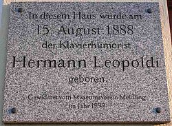 Gedenktafel für Hermann Leopoldi in der Schönbrunner Straße (Wien-Meidling) | Eigenes Werk | GuentherZ | Datei:GuentherZ 2007-04-21 2740 Wien12 Schoenbrunner-Strasse Hermann Leopoldi.jpg | |