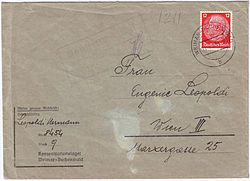 Häftlingsbrief des österreichischen Komponisten Hermann Leopoldi aus dem KZ Buchenwald von 1939. Beschriftung: „Meine genaue Anschrift: Schutzhäftling Leopoldi Hermann, Nr. 8454, Block 9, Konzentrationslager Weimar-Buchenwald“. Adressiert an: „Frau Eugenie Leopoldi, Wien III, Marxergasse 25“. Poststempel: „Weimar-Buchenwald, 11.1.39“. | Privatsammlung institution QS:P195,Q768717 | Scanned by Radzuweit | Datei:Leopoldi Häftlingsbrief.JPG | |