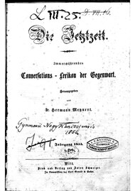 Die Jetztzeit : immerwährendes Conversations-Lexikon der Gegenwart.Wien : Schweiger 1856 vorheriger Besitzer des Buches: hu:Kanizsai Dorottya Gimnázium (Szombathely) | Die Jetztzeit : immerwährendes Conversations-Lexikon der Gegenwart. | Hermann Meynert | Datei:Die Jetztzeit 1856-010.pdf |