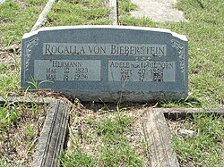 | Gravestone of Hermann Rogalla von Bieberstein (1823-1906), engineer and politician in Texas, and his wife Adele nee Hagedorn (1838-1931). They are burried in Brenham, Washington County, Texas. | Picture private made by US-family Rogalla von Bieberstein | Kuno Rogalla von Bieberstein, Hamburg (Germany) | Datei:RvB Hermann 1823 Grab 007 (2).jpg | |