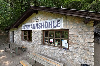 | Gebäude vor der Hermannshöhle in der niederösterreichischen Marktgemeinde Kirchberg am Wechsel . Die größte Tropfsteinhöhle Niederösterreichs wurde angeblich Ende des 18. Jahrhunderts entdeckt, weil ein Hüterbub ins „Taubenloch“ stürzte und man bei seiner Rettung feststellte, dass sich eine geräumige Höhle in die Tiefe fortsetzte. Namensgeber der Höhle ist der damalige Verwalter der Burg Feistritz, Hermann Steiger von Amstein, der 1843 die Höhle genauer untersuchte. Dabei fand er unter anderem den Durchstieg zum „Windloch“. Die Summe aller vermessenen Höhlengänge beträgt 4.430 Meter und der Höhenunterschied 73 Meter: 1 . Die Höhlenbesichtigungstour selbst führt vom „Windloch“ (Einstieg) hinauf zum 43 m höher gelegenen „Taubenloch“ (Ausstieg). Die Hermannshöhle ist auch eines der bedeutendsten Winterquartiere Niederösterreichs für Fledermäuse - bis zu 700 Tiere suchen in der kalten Jahreszeit darin Schutz. Sie beherbergt in der kalten Jahreszeit damit etwa ein Fünftel des österreichischen Bestandes: 2 . | Eigenes Werk | C.Stadler/Bwag | Datei:Kirchberg am Wechsel - Hermannshöhle.JPG | |