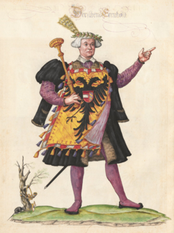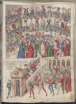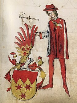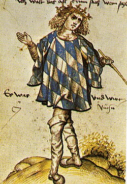 | The Bavarian Herald Jörg Rügen around 1510. On his tabard he displays the arms of the House of Wittelsbach, Dukes of Bavaria | Oesterreichesche Nationalbibliothek (Austrian National Library) Cod. 2936, Part 2, fol 11v. | Autor/-in unbekannt Unknown author | Datei:Jörg Rügen (ca 1510).jpg | |