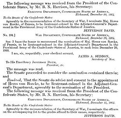 | Nomination of Major Heros von Borcke (1835-1895) to be Lieutenant Colonel of CSA | A Century of Lawmaking for a New Nation: U.S. Congressional Documents and Debates, 1774 – 1875, in: Journal of the Confederate Congress, Volume 4, page 388, 1904/1905 | Datei:Borcke-Lieutenant-Colonel.jpg | ||