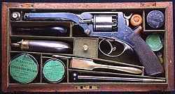 | Tranter revolver, in 1863 given to Confederate Major General James Ewell Brown “Jeb” Stuart by his Prussian (German) Staff Major Heros von Borcke (1835-1895) | http://www.civilwar.si.edu/cavalry_stuartpistol.html# / National Museum of American History, Smithsonian Institution | Datei:Borcke-Stuart-Pistole.jpg | ||