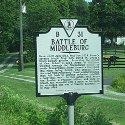 „Hier am 19. Juni 1863 kämpfte die Kavallerie Maj. Gen. J.E.B. Stuarts gegen eine Brig. Union Kavallerie-Division unter General David M. Gregg, um den Marsch von General Robert E. Lees Army of Northern Virginia durch das Shenandoah Valley zum Zwecke der Invasion Pennsylvanias abzusichern. Stuart bildeten eine Linie entlang dieser Bergrücken mit Blick auf Gregg, die von dieser Straße von Middleburg aus angriff. Stuarts führte einen Gegenangriff, und fiel dann wieder auf eine andere defensive Position eine halbe Meile westlich zurück. Bei dieser Aktion wurde Maj Heros von Borcke, ein preußischer Offizier und Adjutant von Stuart, durch eine Kugel in den Hals verwundet; er erholte sich und war an Stuarts Sterbebett am 12. Mai 1864.“