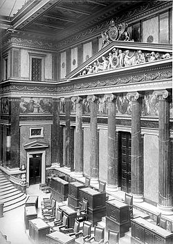 Das Herrenhaus tagte die ersten 22 Jahre provisorisch im Niederösterreichischen Landhaus an der Herrengasse,[17] während das Abgeordnetenhaus sich im sogenannten Schmerlingtheater an der Währinger Straße befand. Für beide Häuser bestanden Pläne, an der neuen Wiener Ringstraße repräsentative Gebäude zu errichten. Es gab Überlegungen, wieder getrennte Gebäude für die beiden Häuser des Reichsrats zu schaffen; sie wurden zugunsten eines gemeinsamen Bauwerks verworfen.[18] Dem Architekturwettbewerb 1864 folgte 1874–1883 der Bau des k.k. Reichsratsgebäudes am damaligen Franzensring nach dem Entwurf von Theophil Hansen.