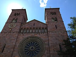 Die Kirche wurde im neuromanischen Stil aus rötlich-violetten Porphyrsteinen als Basilika mit einer Doppelturmfassade geschaffen. An dieser befindet sich eine sechzehnteilige Rosette, ein Mosaik von Ignaz Stolz in der Fassadengalerie, die Neun Chöre der Engel darstellend, und im Tympanon des Rundbogentores ein Relief mit dem Bild Rudolf von Habsburgs von Alois Winkler. An einem der beiden 40 Meter hohen Türme ist eine Uhr und darunter die halb vergoldete, halb blaue Kugel des Mondes, die sich mit den Mondphasen dreht. Die sieben Glocken stammen von der Firma Colbacchini aus Trient; die größte davon wiegt 3071 kg.