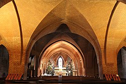 Um möglichst vielen Personen freie Sicht auf den Altarraum zu bieten, wurde die Kirche als gerichtete Wegkirche mit Seitenkapellen, stützenfreiem Innenraum und in die Hochschiffwände integrierten Pfeilern erbaut. Das strenge Erscheinungsbild des großen freien Innenraums wird durch farbige Fenster und Wandfresken aufgelockert. Der innen vorherrschende einheitliche Gesamteindruck ist der Tatsache zu verdanken, dass Hauberrisser jedes noch so kleine Detail selbst gestaltet hat und die originale Ausstattung vollständig erhalten geblieben ist.