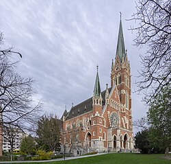 Nach langen Diskussionen über den Baustil (der Bau einer Kirche nach Art der Wiener Votivkirche musste aus Kostengründen verworfen werden) wurde schließlich der aus Graz stammende Georg von Hauberrisser, Architekt des Münchner Rathauses, mit der Errichtung der Kirche im neugotischen Backsteinstil nach Art der norddeutschen Kirchen im Stil der Backsteingotik beauftragt. Die Grundsteinlegung erfolgt 1881, im Jahr 1885 wurde Dachgleiche gefeiert und 1887 der hohe Turm fertiggestellt. Am 5. Juni 1891 wurde die Kirche geweiht, aber erst am 10. Oktober 1902 zur Pfarrkirche erhoben. In den Jahren 2004 und 2005 wurde eine umfassende Außenrestaurierung durchgeführt (siehe Weblinks).