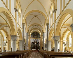 Das dreijochige Langhaus wird von Kreuzrippengewölben abgeschlossen, die durch große Oculi im Obergaden Licht erhalten. Arkaden über romanischen Säulen mit Würfelkapitellen öffnen sich zu den Seitenschiffen mit faschengerahmten Rundbogenfenstern, die von Kreuzrippengewölben abgeschlossen werden. Die Gewölberippen des Langhausgewölbes enden auf Gewölbeanfängern über Halbsäulen, die auf den Würfelkapitellen der Arkaden ansetzen. Die Arkadenbogen sind putzfaschengerahmt und leicht reliefiert, darüber erstreckt sich über die gesamte Länge der drei Joche ein reliefiertes Gesims.[3]