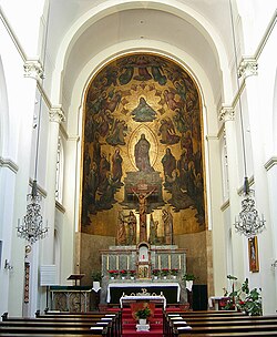In der Apsis ist eine Wandmalerei auf Goldgrund Christus als Herz Jesu unter Gott Vater mit Ordensheiligen, Aposteln und Propheten umgeben von Engelschören vom Maler Josef Kastner der Ältere.