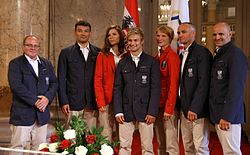 | Das Judo-Team - von links: Klaus-Peter Stollberg (Trainer), Taro Netzer (Trainer), Hilde Drexler , Ludwig Paischer , Sabrina Filzmoser , Udo Quellmalz (Trainer) und Othmar Haag (Trainer) - bei der offiziellen Verabschiedung der österreichischen Olympiamannschaft für die Sommerspiele 2012 in London im Zeremoniensaal der de:Hofburg in Wien . | Eigenes Werk | Manfred Werner - Tsui | Datei:Team Austria - Olympic Games 2012 - reception at Hofburg c20 judokas.jpg |
