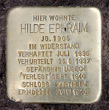 Im Juli 1936 wurde Hilde Ephraim selbst verhaftet und von der Gestapo schwer misshandelt. Der Volksgerichtshof verurteilte sie am 25. Juni 1937 zu vier Jahren Zuchthaus. Sie wurde erst in Lübeck und anschließend in Amberg interniert. Zeitweise soll sie die Nahrungsaufnahme verweigert haben und letztendlich in „geistige Umnachtung“ gefallen sein.[2] Im September 1940 wurde sie im Rahmen der Aktion T4 in die NS-Tötungsanstalt Hartheim verschleppt, wo sie am 20. September 1940 ermordet wurde.[3] Zur Verschleierung ihrer tatsächlichen Todesumstände wurde ihrer Familie die „Irrenanstalt Chelm“ als Sterbeort mitgeteilt, der als solcher in einigen Unterlagen erhalten ist.